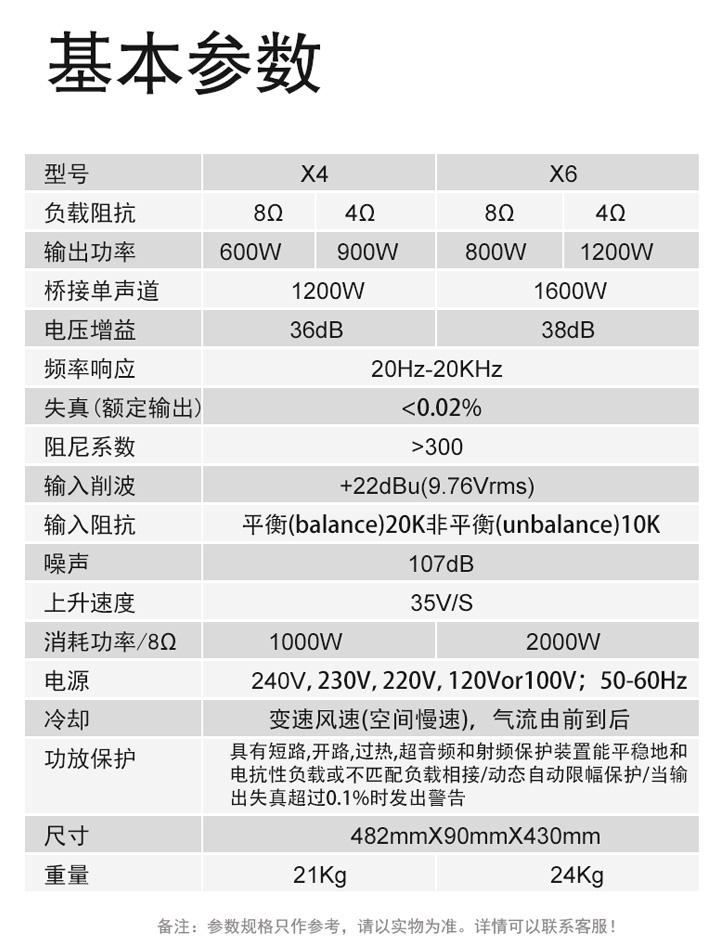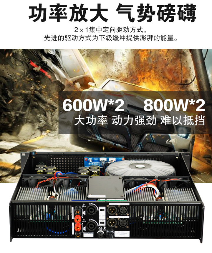 2U外观设计,输入有平衡、非平衡两种方式,立体声/单声道/桥接三种不同工作模式。具有可靠的开机延迟,过载、过温、短路、零等多重保护采用大容量滤波电容,优质环形低漏磁高值片变压器和高品质音频大功率输出管。重量轻使得运输和组装都非常容易,专门设计的底盘,可提供额外的耐用性和强度由于每个通道都采用 Neutrik speakon输出插口和1/4英寸输出插口再加上2路接线柱,可提供杰出的连接灵活性。功率管直贴散热器,大功率自动调节双速风扇有效降低机内温度,提高系统可靠性所提供的综合保护措施包括电源开/关静音、DC检测、热保护、电流/限制和衰器保护罩。