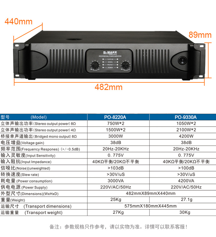 * 信号和削波发光LED指示灯可监视功放的工作状态。