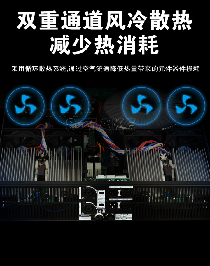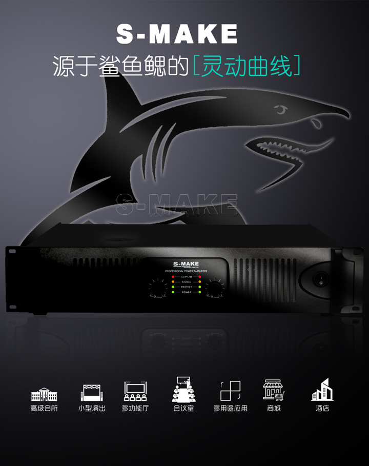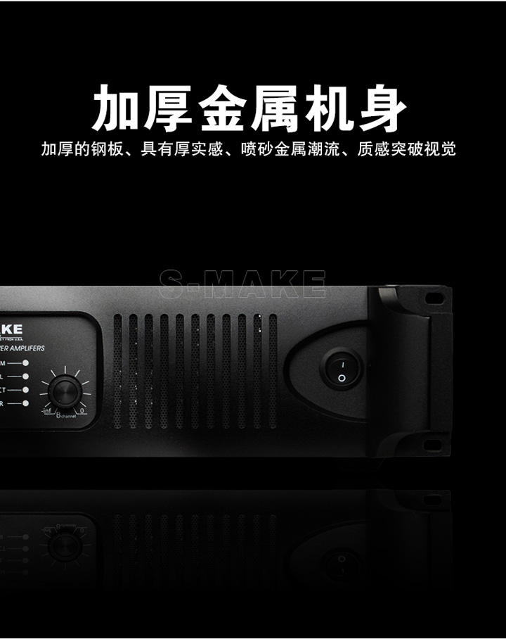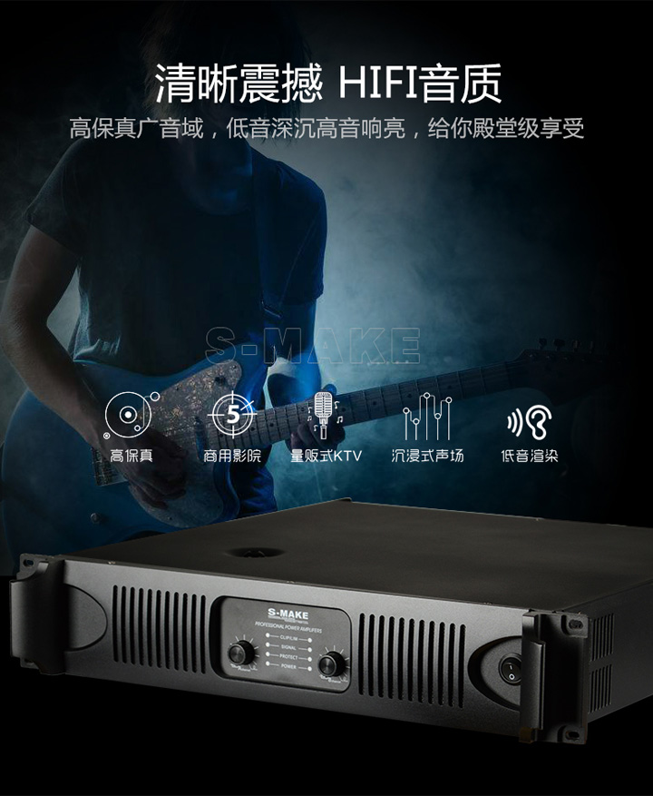 * Full-automatic protection circuit which including DC,overcurrent,overvoltage、overheating and dynamic automatic limitation protection, ensure the stabilization and efficience of the amplifier.
