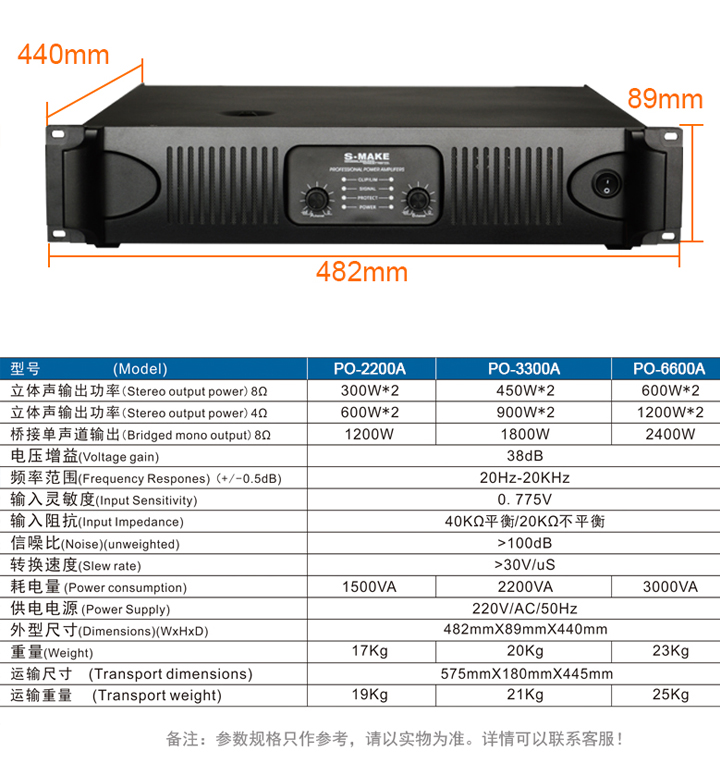 * 信号和削波发光LED指示灯可监视功放的工作状态。