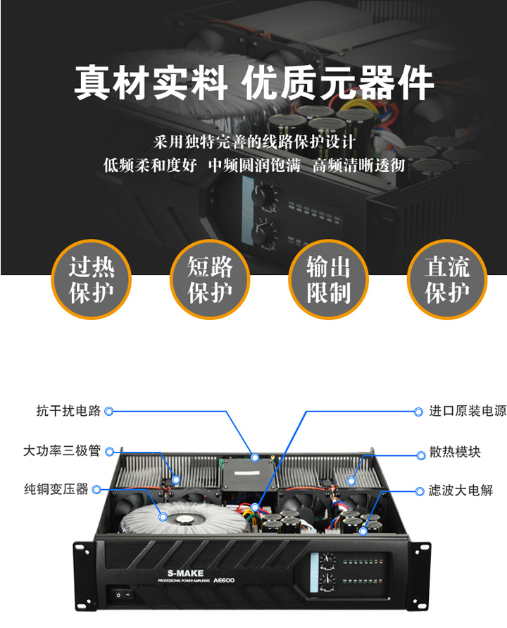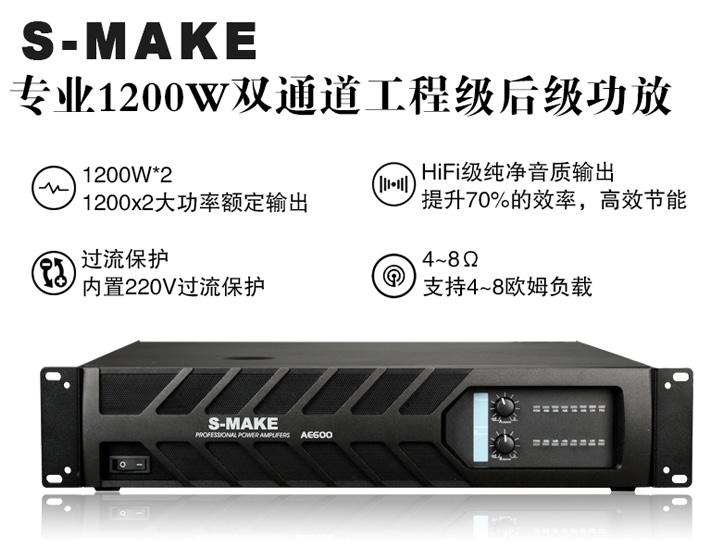AE series amplifier adopts unique and perfect circuit protection design, low bass foot, small distortion, stereo 2-channel, special