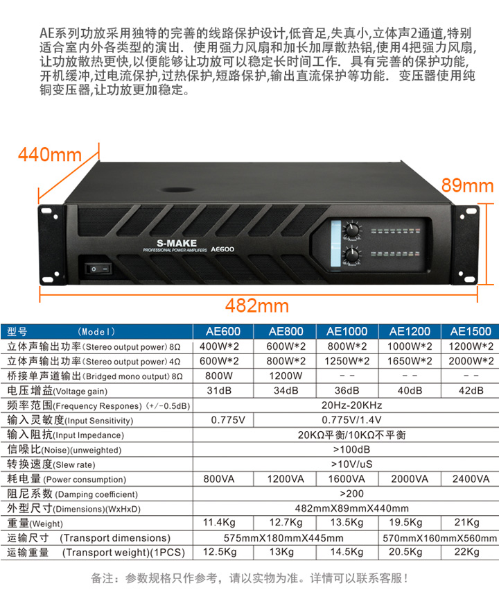 AE系列功放采用独特的完善的线路保护设计,低音足,失真小,立体声2通道,特别