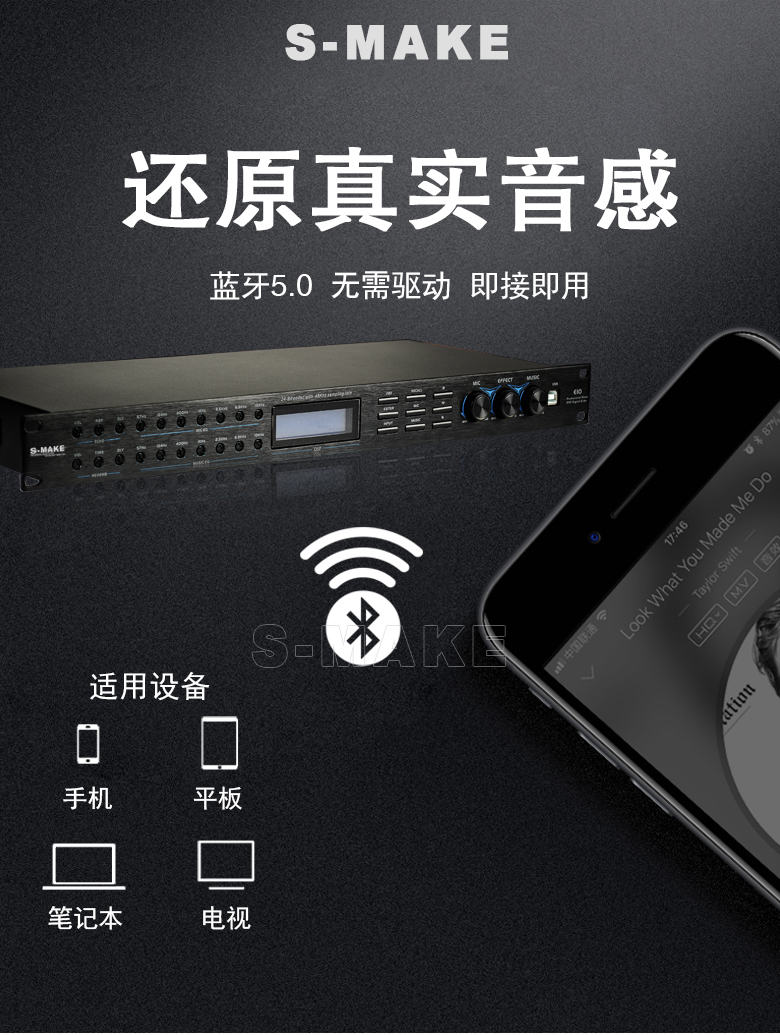 5:麦克风双混响效果,音乐和话筒各外置7段参量均衡前面板可调节LCD液晶显示.