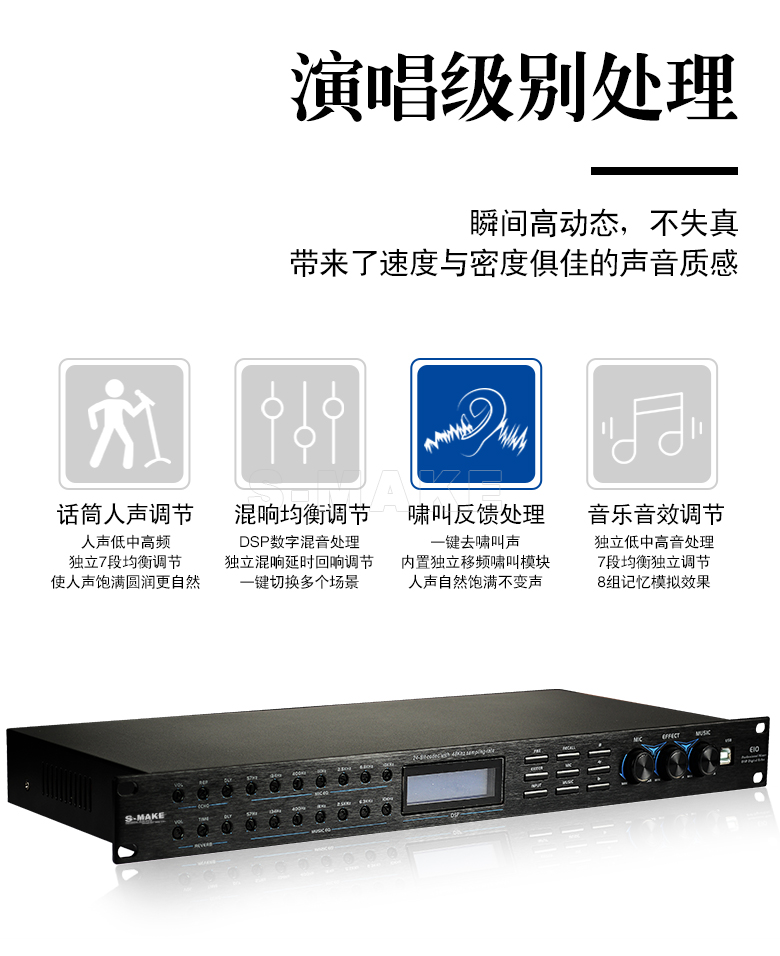 1: This product adopts 48 bit high-performance DSP and AD / DA conversion processing, wide frequency band, large dynamic, 48Hz sampling frequency professional digital karaoke processor.